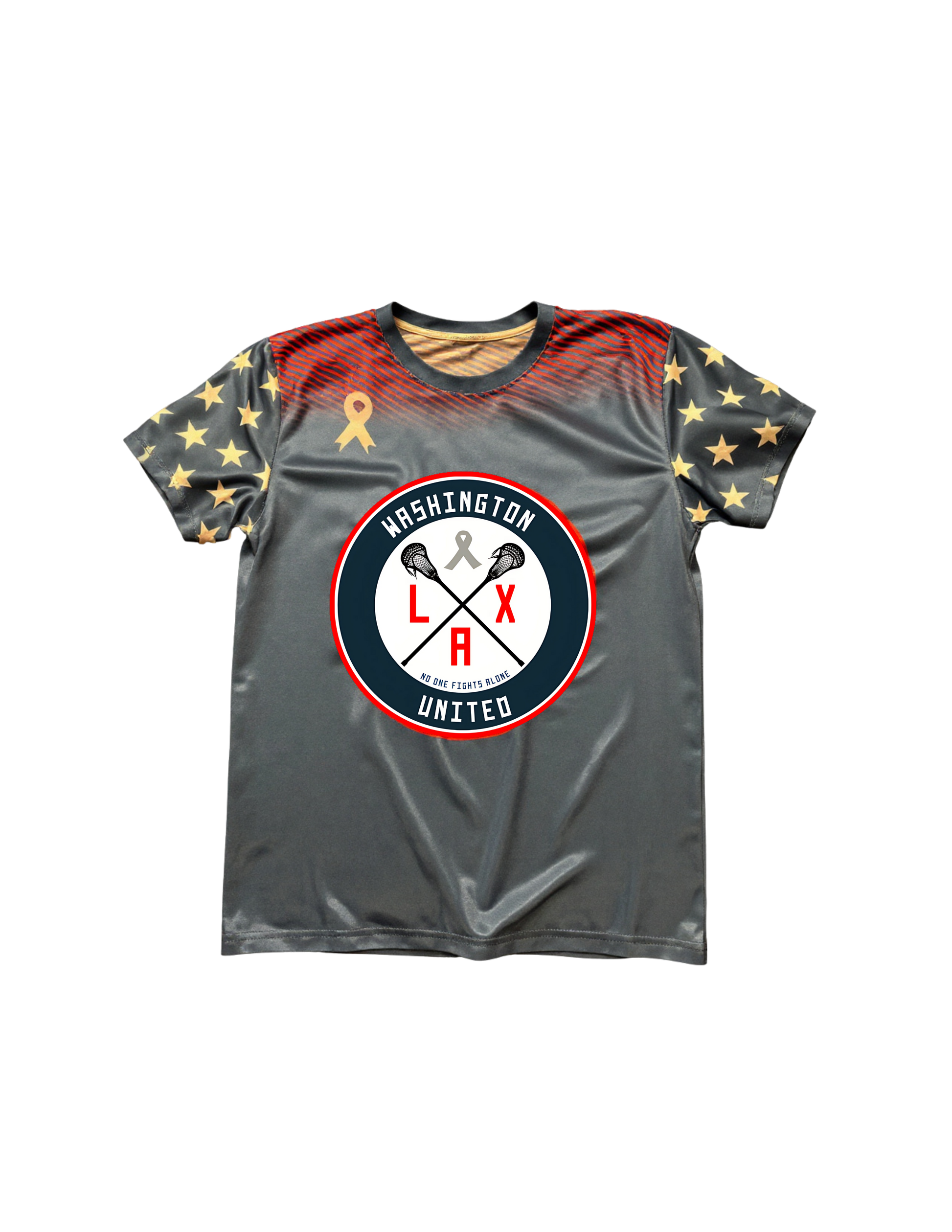 The design features a bold Washington United LAX crest centered on the chest, complete with crossed lacrosse sticks and the empowering slogan “No One Fights Alone.” The shoulders and sleeves are detailed with a patriotic star pattern, while the upper chest fades into a dynamic red gradient. The back shows the #PlayUnited on the bottom.